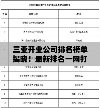 三亞作為中國著名的旅游勝地,吸引了眾多企業(yè)前來投資發(fā)展,本文將介紹三亞開業(yè)公司的排名榜,為您了解三亞商業(yè)環(huán)境和企業(yè)發(fā)展?fàn)顩r提供參考。